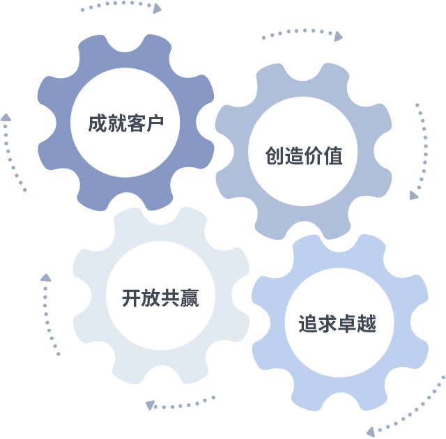 成就客户是一切决策的出发点,,,,创造价值是衡量所有工作的标准,,,追求卓越是我们做事做人的态度,,,开放共赢是我们的格局也是最终的结果。。。。价值观的齿轮环环相扣,,,推动着组织里的每个人不断向前。。